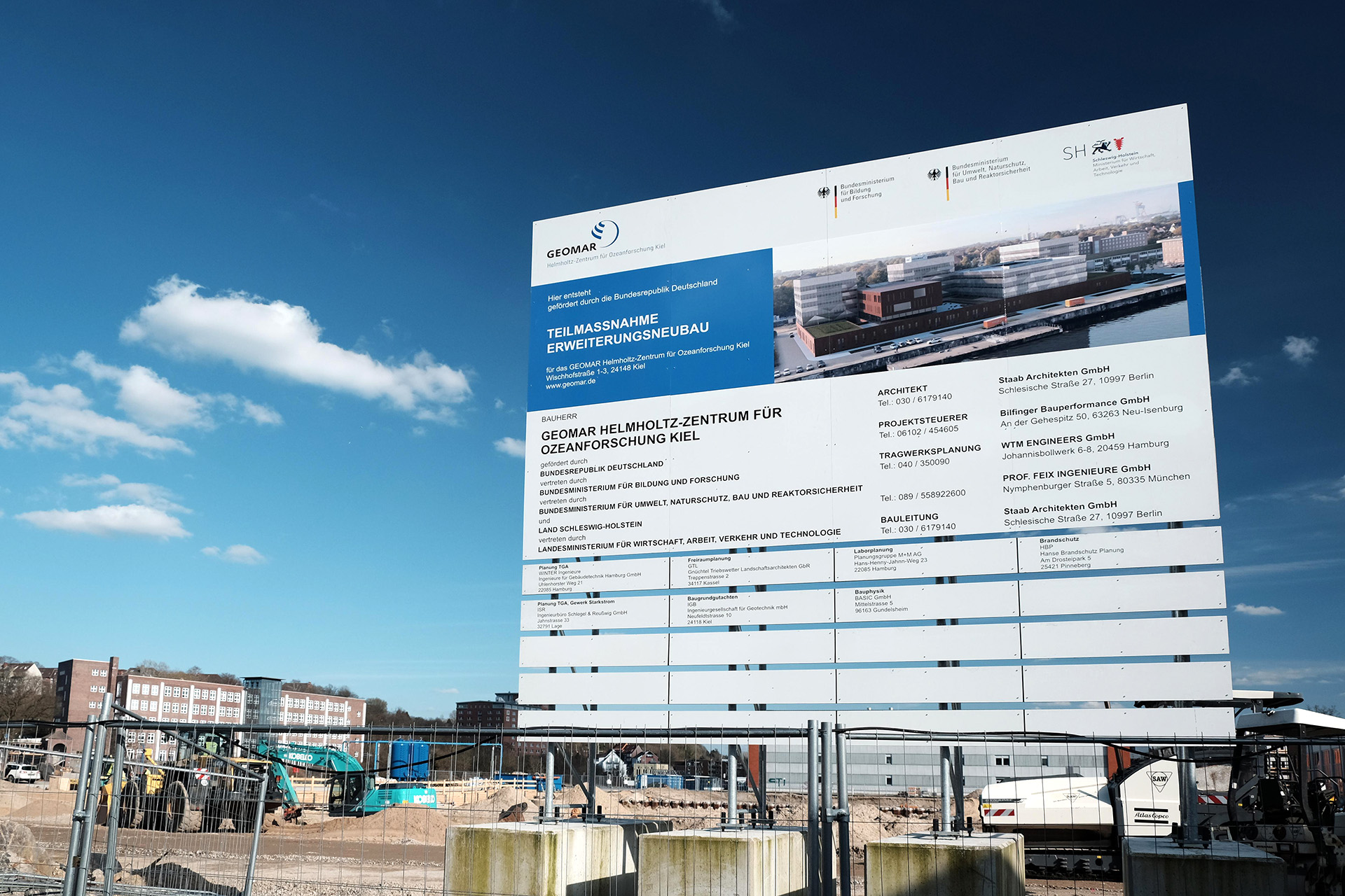 März 2017: Das Bauschild steht, ein sichtbares Zeichen für den bevorstehenden Beginn der Tiefbauarbeiten und der Erstellung der Bodenplatte für den Erweiterungsneubau. Foto: Jan Steffen/GEOMAR