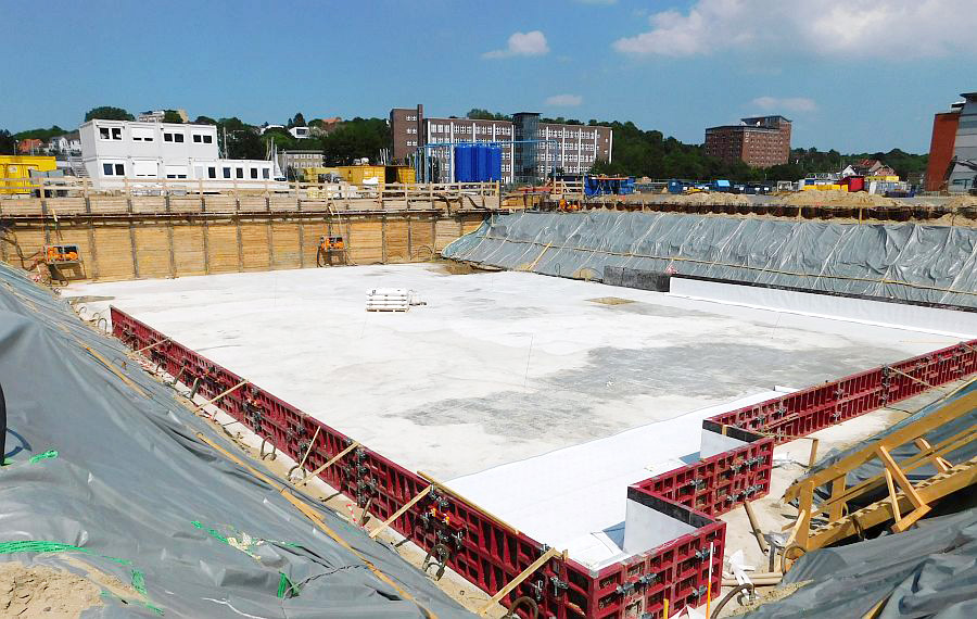 Die zukünftige Sohle des Gebäudes aus massivem Stahlbeton muss auf einer absolut ebenen und trockenen sogenannten Sauberkeitsschicht errichtet werden, damit es später nicht zu Abweichungen und Verzerrungen im Baukörper kommt. Foto: Bauteam GEOMAR