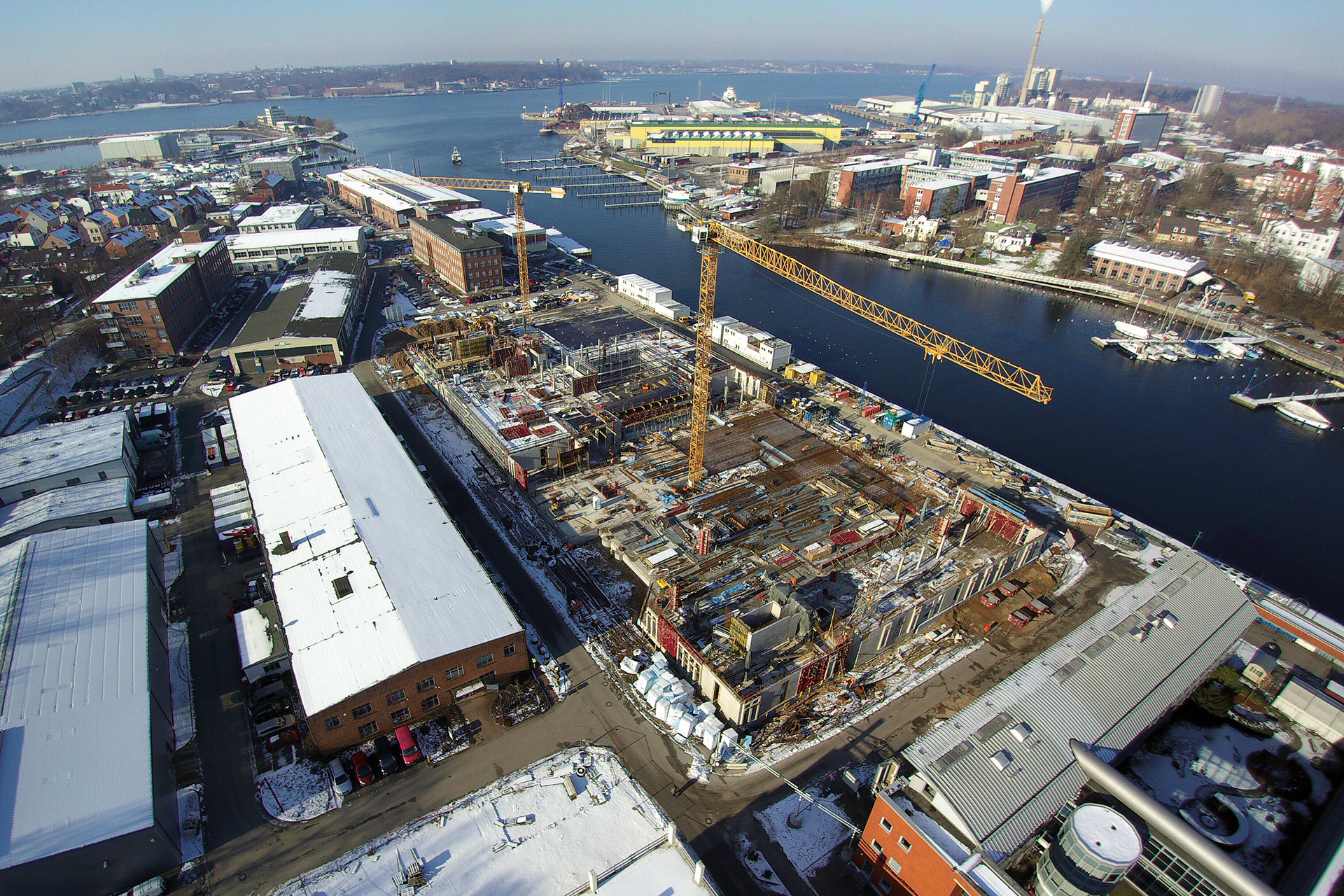 01 | Die Baustelle des Erweiterungsneubaus (ENB) im Februar 2018. Nach Fertigstellung der Tiefbauarbeiten und der Bodenplatte in 2017 werden nun die ersten Bauelemente des Erdgeschosses angebracht. Foto: Ralf Schwarz/GEOMAR