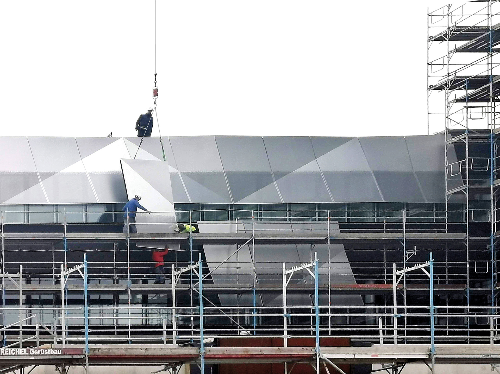 Seit Herbst 2019 bekommt die Fassade langsam ein Gesicht: Anbringung der Fassadenelemente aus Aluminium-Lochblech am Turm 4. Foto: Armin Form/GEOMAR