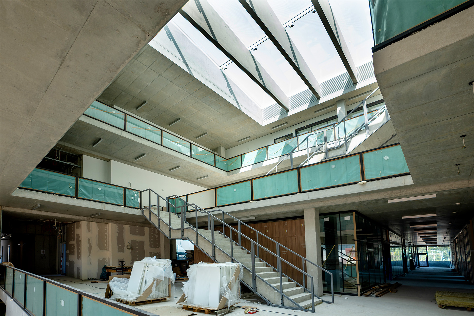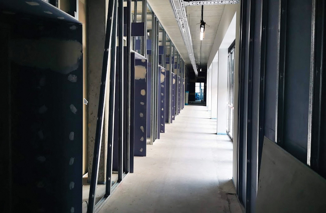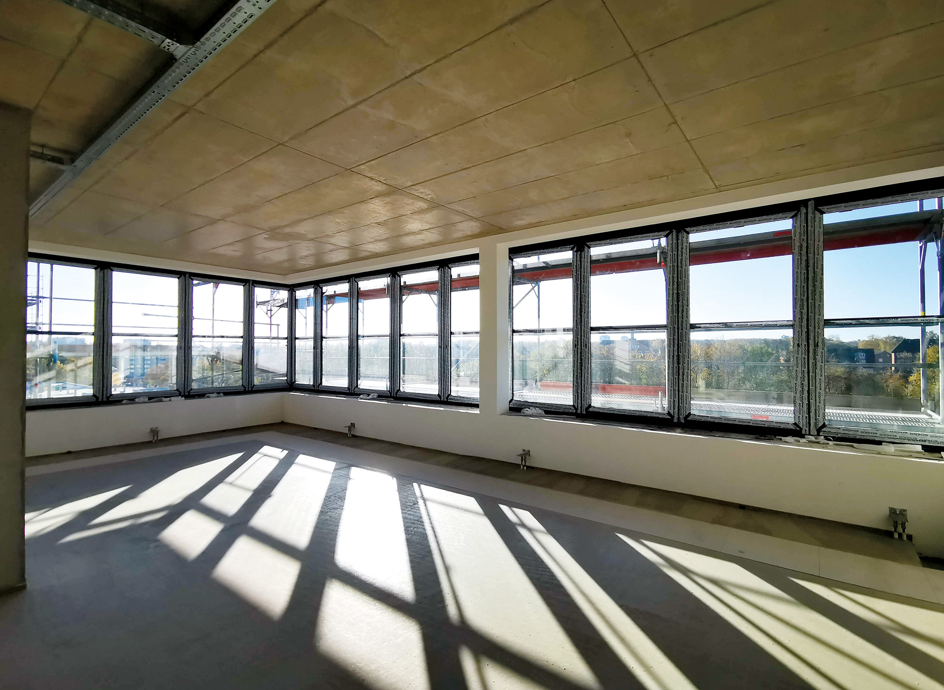 Nachdem das Gebäude durch den Einbau der Fenster witterungsgeschützt ist, können seit August 2019 auch die Arbeiten im Inneren des Gebäudes stattfinden.