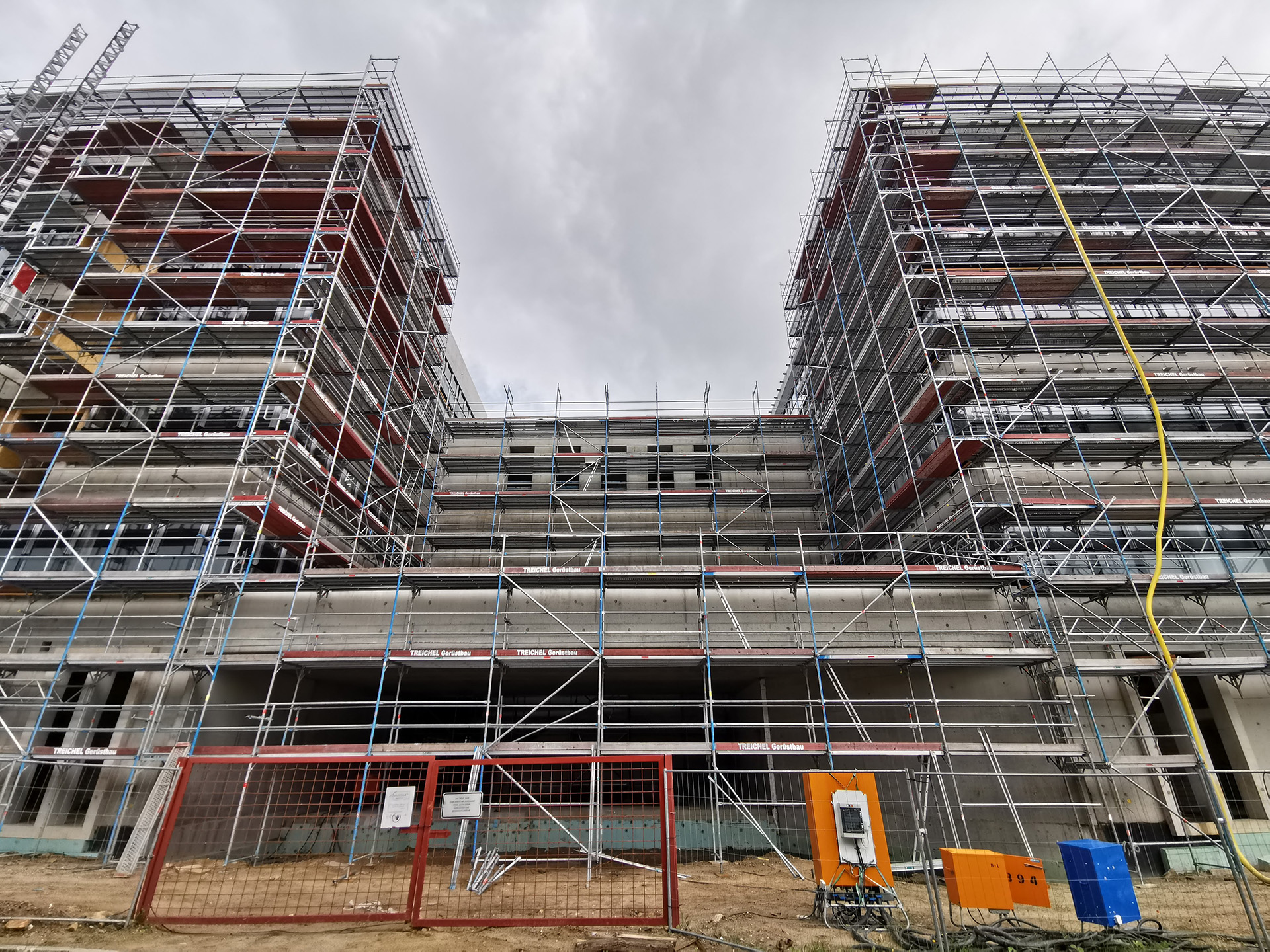 Haupteingang mit den Türmen 1, 2 und 3. Der Rohbau steht und wird eingerüstet zum Einbau der Fenster und Fassadenelemente. Foto: Armin Form/GEOMAR