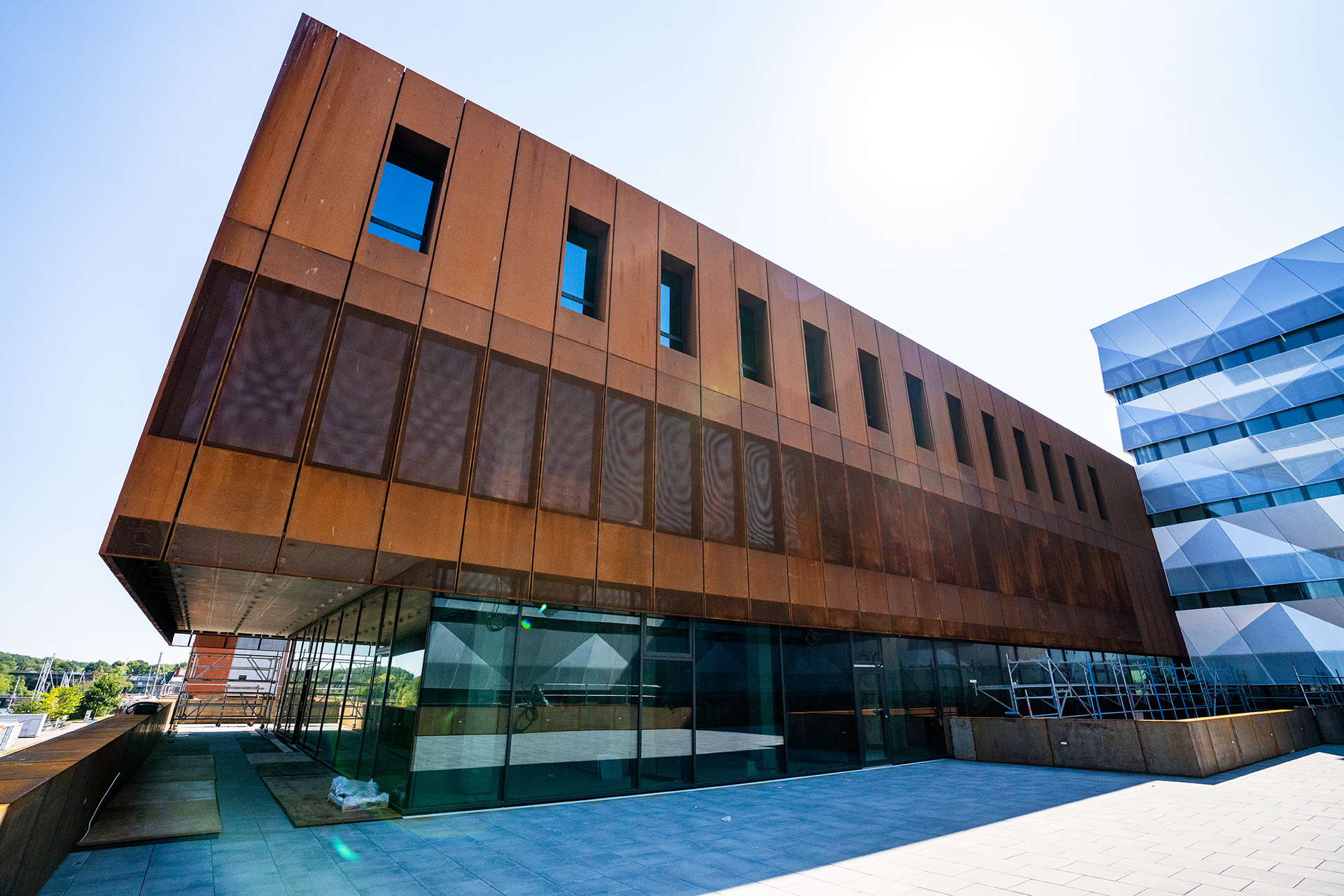 Der Turm 2 des ENB mit einer Fassade aus Cortenstahl. Hier sind unter anderem die Bibliothek und verschiedene Konferenz- und Seminarräume untergebracht. Foto: Sarah Kaehlert/GEOMAR