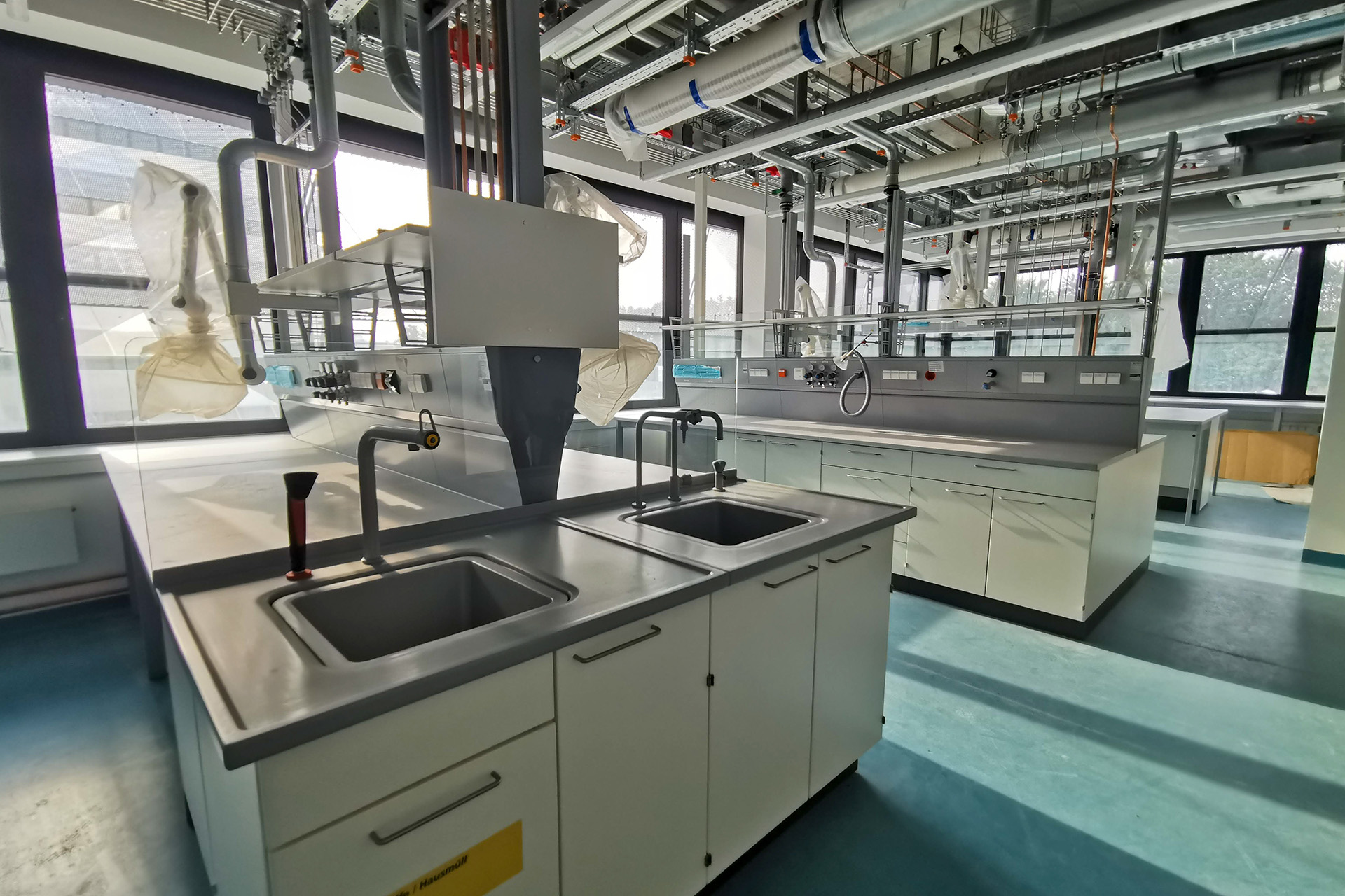 03 | Blick in das Musterlabor, in dem bereits alle Einrichtungen fertiggestellt sind. Hier können die am Bau beteiligten Firmen ihre Schnittstellen noch einmal vor Ort abzustimmen, bevor alle weiteren Labore errichtet werden. Foto: Marie Gundlach/GEOMAR