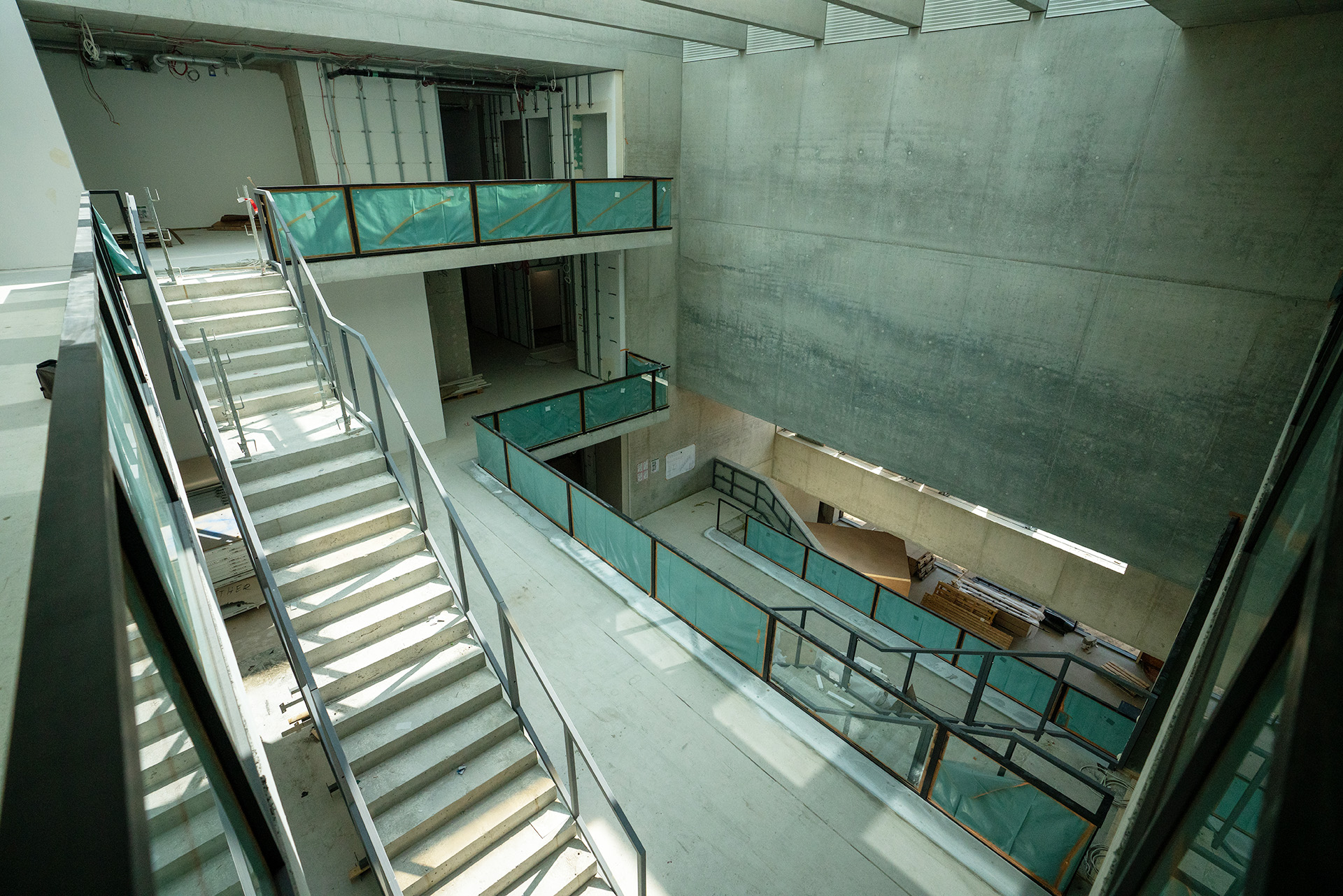 Das Treppenhaus vom 3. Stock aus. Auf die große Wandfläche wird nach ENB-Inbetriebnahme eine künstlerische Videoinstallation projiziert. Foto: Sarah Kaehlert/GEOMAR